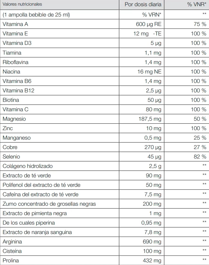 Agua, colágeno hidrolizado, dicitrato de trimagnesio, acidulante: ácido láctico; L-arginina, zumo concentrado de grosella negra [Ribes nigrum (0,7 %)], L-cisteína, L-prolina, extracto de té verde (Camellia sinensis), ácido L-ascórbico, citrato de zinc, acetato de DL-a-tocoferilo, nicotinamida, retinol palmitato, extracto de naranja sanguina (Citrus sinensis), gluconato de cobre, clorhidrato de piridoxina, sulfato de manganeso, riboflavina, clorhidrato de tiamina, extracto de pimienta negra (Piper nigrum), selenato de sodio, D-biotina, colecalciferol, cianocobalamina, conservante: sorbato de potasio, benzoato sódico, espesante: goma xantana; aroma, edulcorantes: glucósidos de esteviol, ciclamato sódico, acesulfamo K, sacarina sódica.